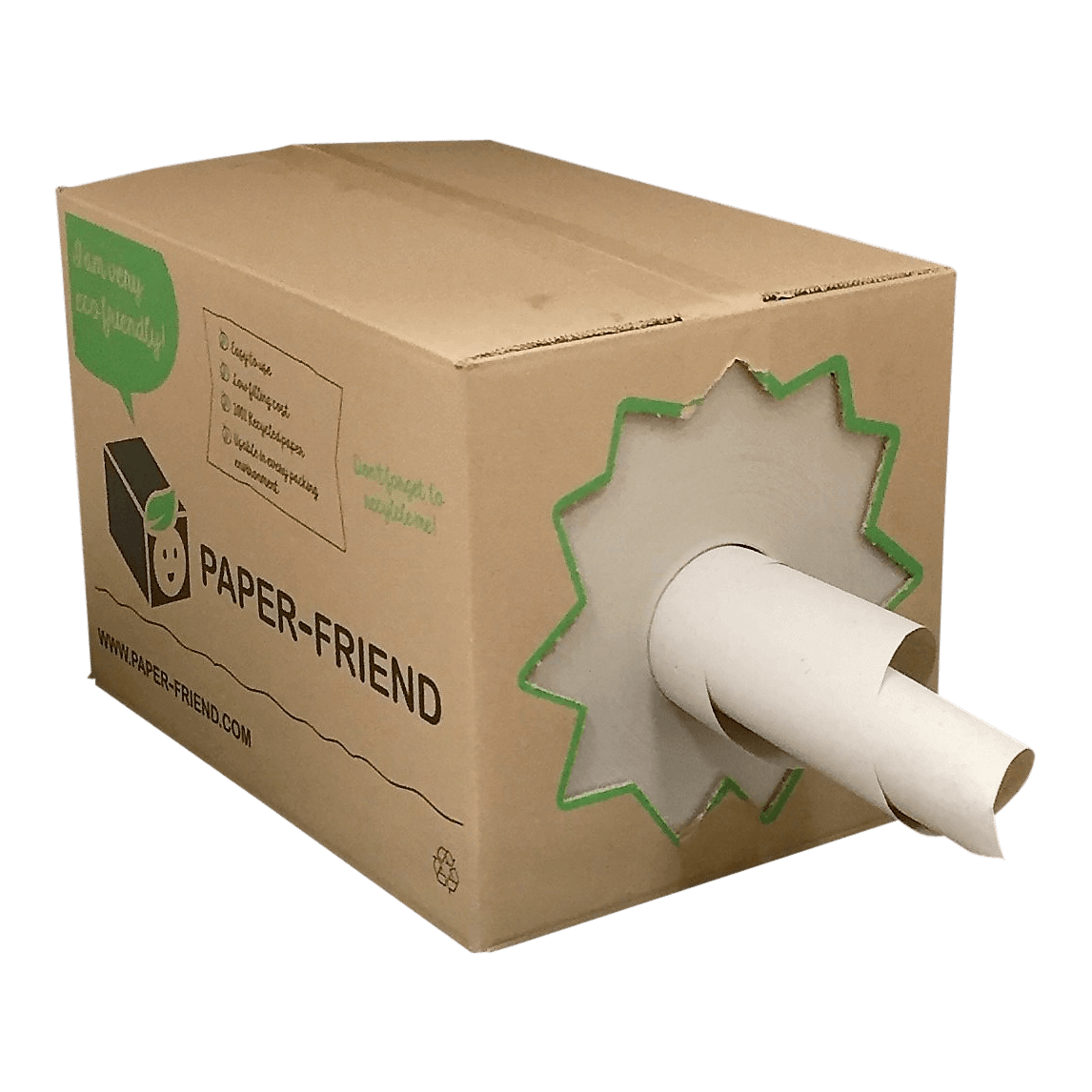 Met deze handige dispenserdoos van het merk PAPER-FRIEND voorzien een rol papier kunt u op een eenvoudige manier uw verzenddozen met kwetsbare artikelen opvullen. U opent de doos aan de zijkant en trekt het papier eruit. U kunt het papier makkelijk afscheuren. Daarna maakt u er proppen of 'slangen' van. Ook kunt u het product omwikkelen met het papier. De handzame box kan overal in uw bedrijf worden geplaatst. De PAPER-FRIEND box bevat ca. 1500 liter opvulmateriaal, dit staat ongeveer gelijk aan 3 grote zakken opvulchips van 500 liter. Dit 100% gerecycled papier is een milieuvriendelijk oplossing! Wij hebben dit opvulpapier in 2 diktes; 60 gram per vierkante meter en 80 gram per vierkante meter.