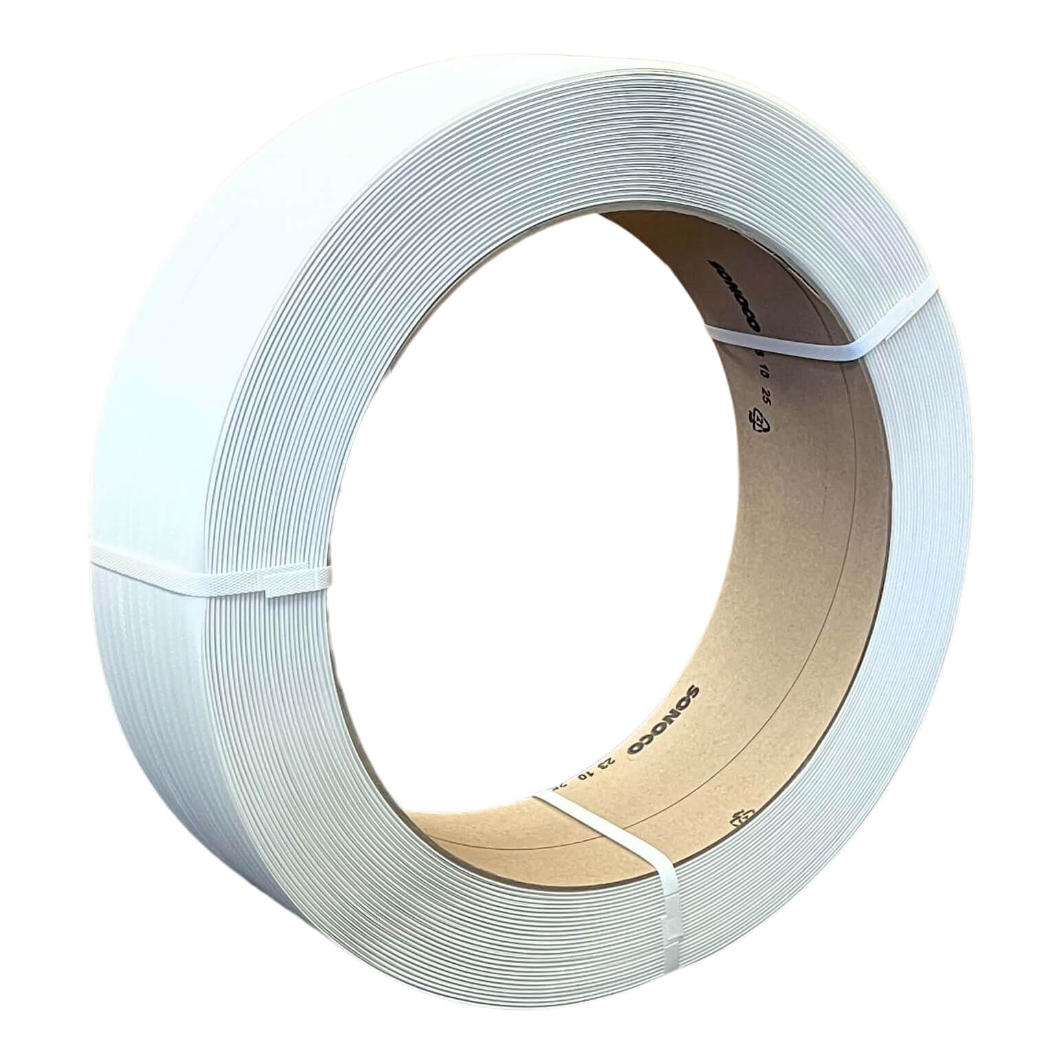 Polypropyleen omsnoeringsband is een soepel, licht en waterbestendig band voor het omsnoeren van lichte dozen, bundels en pallets. PP omsnoeringsband kan worden vastgezet met zegels of gespen. Breedte 12mm, dikte 0,55mm, lengte 3000m, diameter rolkern 406mm. Kleur wit. De gemiddelde treksterkte is ca. 133 kgf. Dit artikel is geschikt voor handmatig en machinaal omsnoeren. Verpakking 1 rol per doos. Dit PP omsnoeringsband bevat 40% gerecycled materiaal. PP omsnoeringsband is een niet giftig plastic en kan goed worden gerecycled worden.